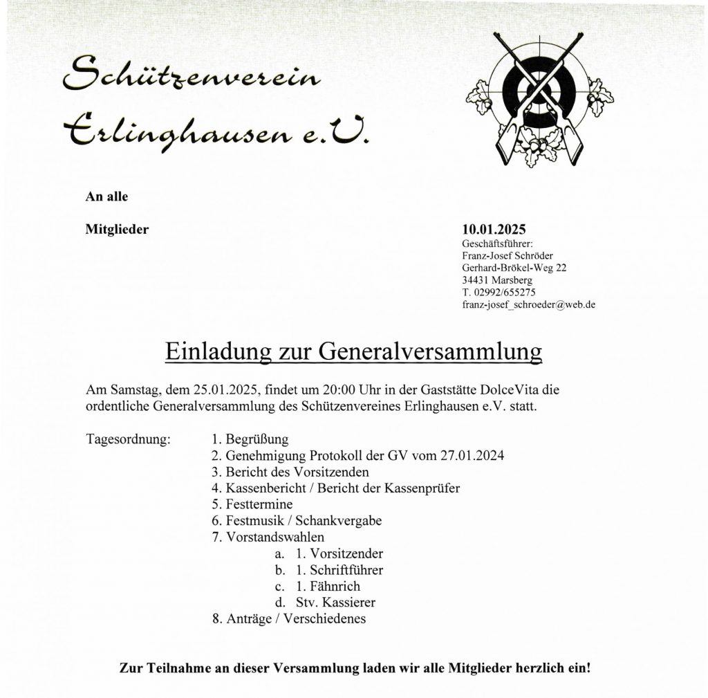 Einladung zur Generalversammlung HaraldJanuar 12, 2025Januar 12, 2025 Uncategorized ← Kinderschützenfest und Feldgottesdienst Einladung und Programm zum Jubiläumsschützenfest am 12.04.2025 →
